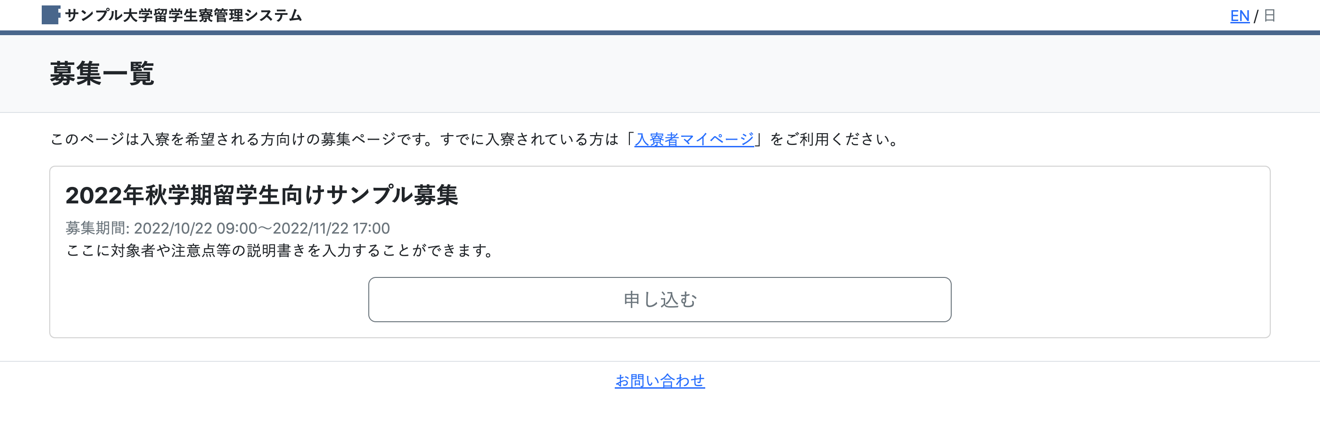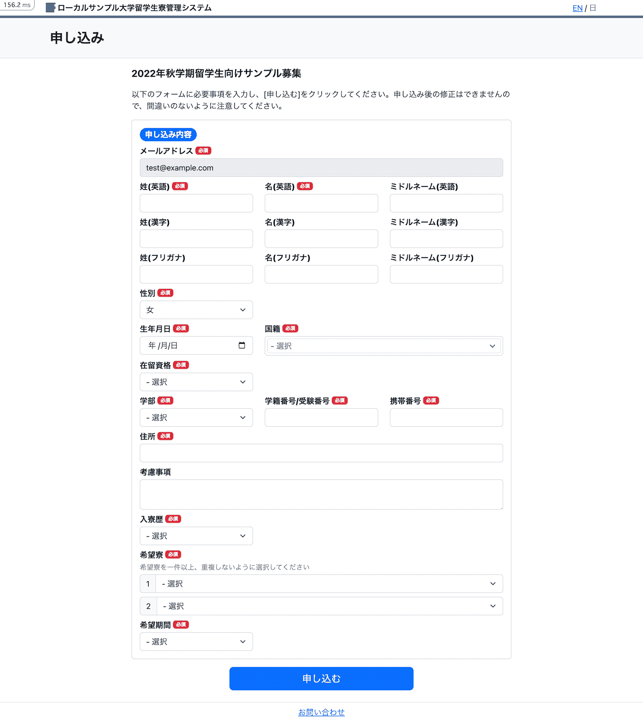 申し込み内容を入力を行う画面です。名前等の基本情報や、希望寮、入寮期間の登録を行います。登録を完了すると申し込み完了画面が表示されると共に内容確認メールが送信されます。希望寮や希望期間は、募集設定で選択した寮、期間のみが選択可能になります。募集パターン設定で保証人情報の取得がONの場合は、対応する入力欄が表示されます。また、自由な質問項目を追加することもできるため、例えば、入寮動機アピール文章のような審査のための質問を加えることも可能です。