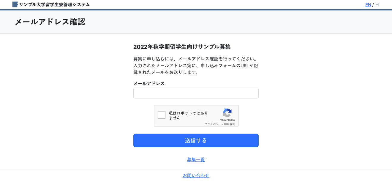 申し込み内容の入力に先立ち、メールアドレスの確認を行う画面です。入力されたメールアドレスへ確認メールが送信され、そのメール内のリンクをクリックすることで申し込みへと進むことができます。