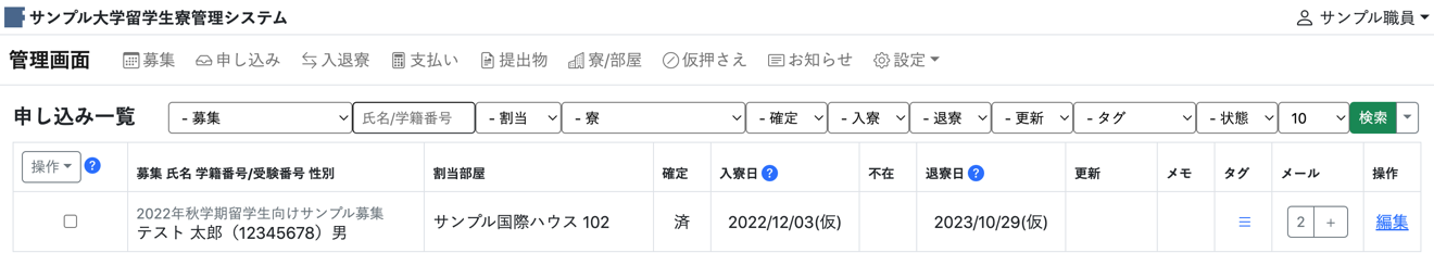 入寮申し込みの一覧を確認することができる画面です。申し込み内容の確認、編集はもちろん、自動割り当てや確定操作、個別のメール連絡等、申し込みに付随する業務をまとめて行うことができるようになっています。システムから送信されたメールは自動的に蓄積されるようになっており、過去のやりとりも含めて情報の一元管理を行えるようになっています。