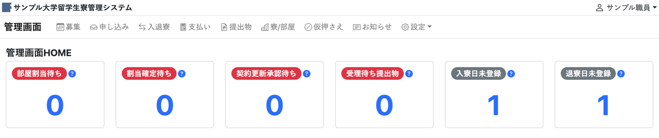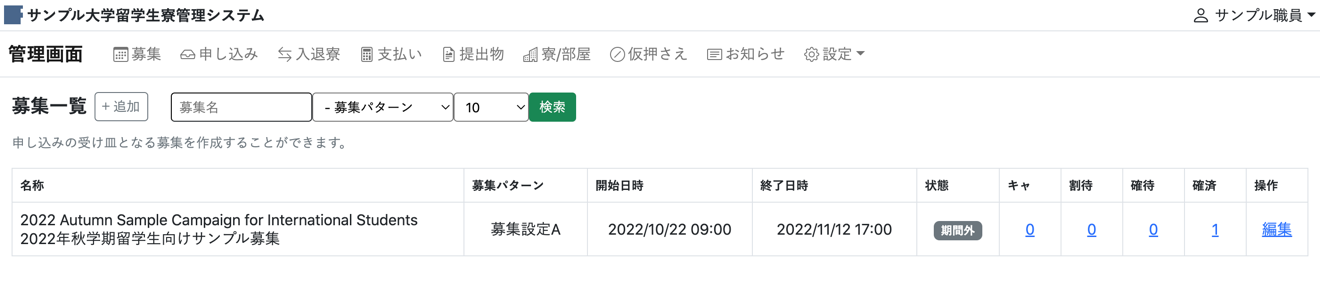 入寮申し込みを受け付ける箱となる募集を管理することができる画面です。すでに登録済みのものの確認、編集や、新規追加が可能です。それぞれの募集ごとに、どの段階の申し込みが何件あるかがすぐにわかるようになっており、数字のリンクをクリックすることでフィルタされた状態で申し込み一覧画面に遷移することができます。
