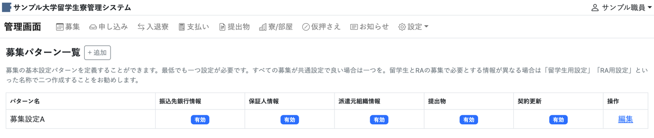 募集の際にどういった項目を求めるか、どういった機能をONにするかのパターンを登録することができます。募集パターンを使い分けることで、留学生用の募集と日本人用の募集を効率的に区別して運用することができます。