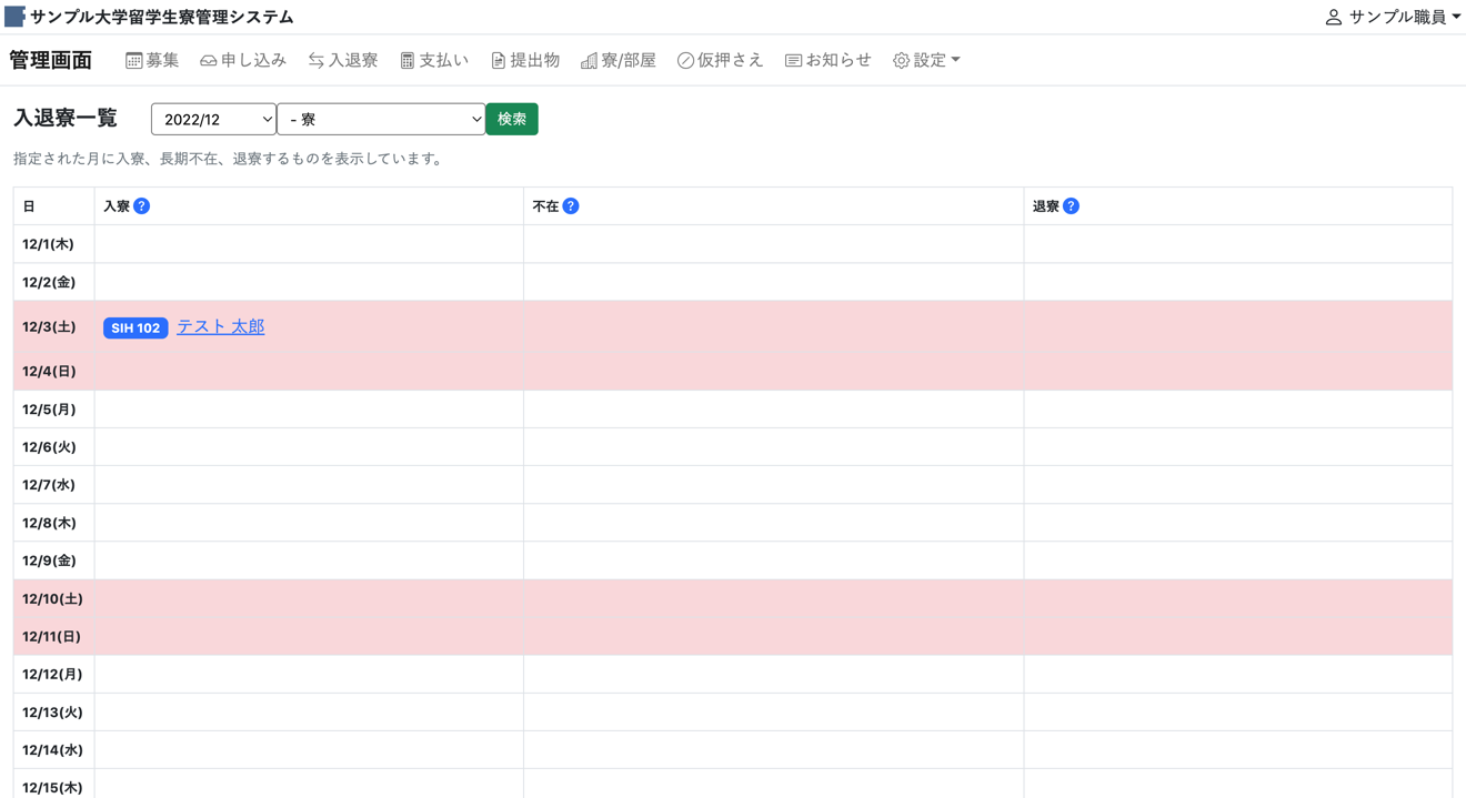 月ごとに、入寮者、退寮者、長期不在者を一覧で見ることができる画面です。入寮や退寮対応のためのカレンダーとしてお使いいただけます。入寮確認や退寮確認の操作もこの画面から行えるようになっています。縦に長い画面のため見切れていますが、1ヶ月の日にちすべてが画面には表示されます。