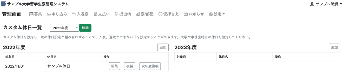 寮マスタを管理できる画面です。名称管理に加えて、寮ごとの退寮登録期限や、休日設定も行うことが可能です。
