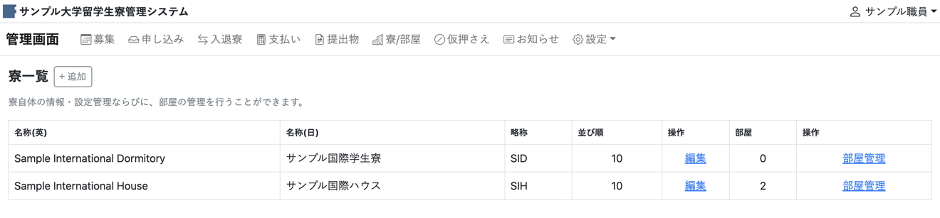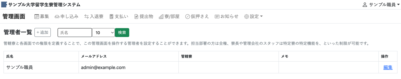 管理画面を利用できる管理者を設定、管理することができる画面です。管理者ごとに管轄する寮を設定して表示できる情報を制限したり、管理画面内の情報や機能の編集権限を制限することができます。