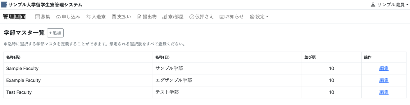 申し込みの際に選択する学部のマスタ情報を管理できる画面です。