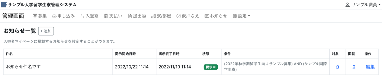 入寮者マイページに掲示するお知らせを管理することができる画面です。様々な条件で掲示対象を設定できることに加え、閲覧状況の確認を行うことができます。