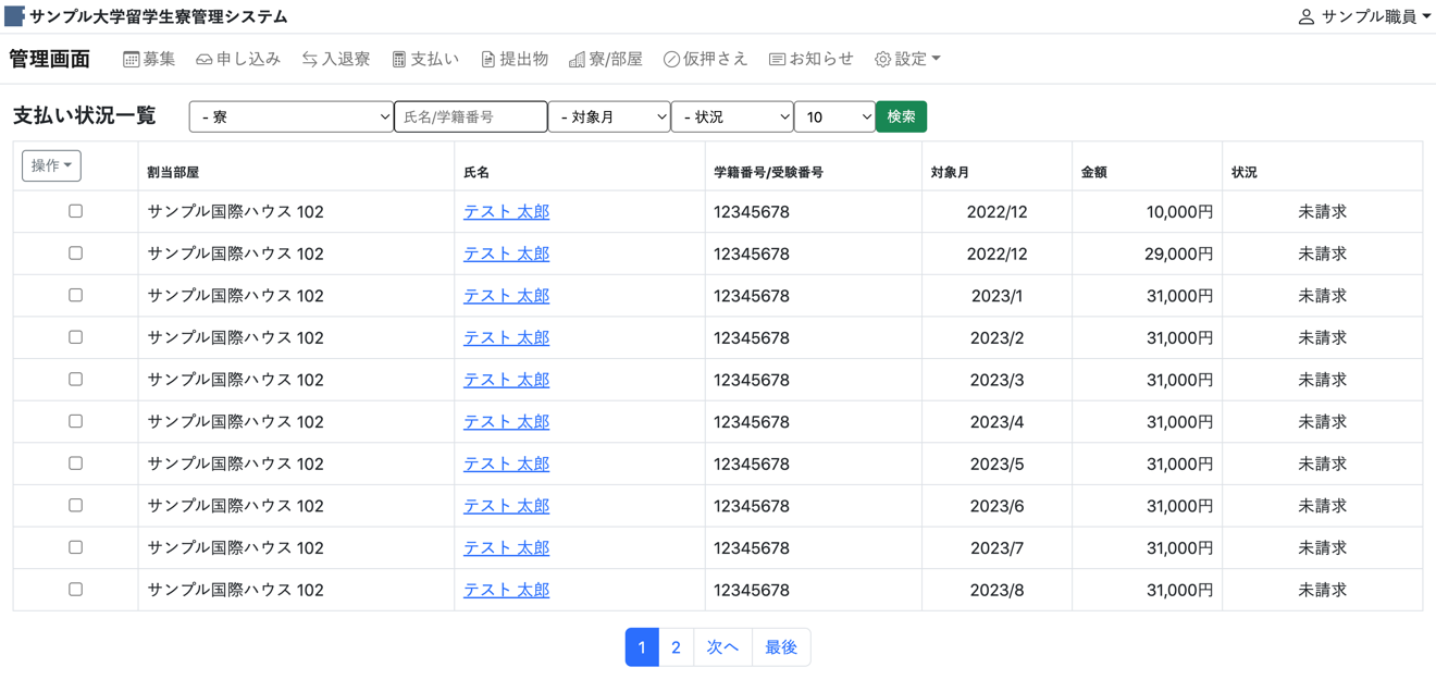 入寮者の支払い状況の確認、更新を行うことができる画面です。支払い状況でフィルタし、チェック操作で一括更新をかけることができます。