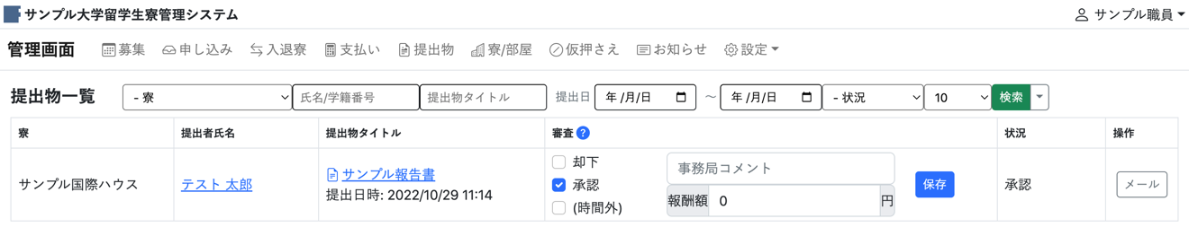 RA(DA)等の提出物を管理することができる画面です。入寮者マイページから提出されたものが表示され、内容の確認、審査と、報酬額の設定を行うことが可能です。内容はCSVエクスポートできるようになっていますので、関連部署への振り込み依頼もスムーズに行えます。入寮者側に機能開放したくない場合は、募集パターン設定でOFFにすることも可能です。