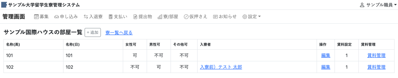 部屋マスタを管理できる画面です。名称管理に加えて、部屋ごとの入寮可性別設定や、賃料設定を行うことができます。