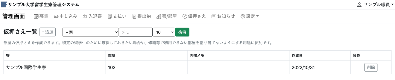 特定の申し込みのために部屋を確保しておきたい場合や、修繕等で部屋が使用できない場合等に便利な部屋の仮押さえを作成、管理できる画面です。