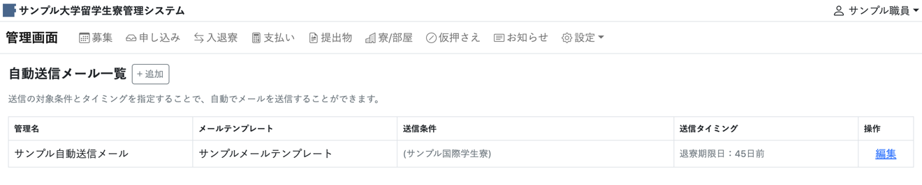 入寮情報や退寮情報の督促など、システムから何かしらのメールを自動的に定期配信したい場合に使用する自動送信機能を設定、管理する画面です。様々な条件、送信タイミングでスケジューリングすることができます。