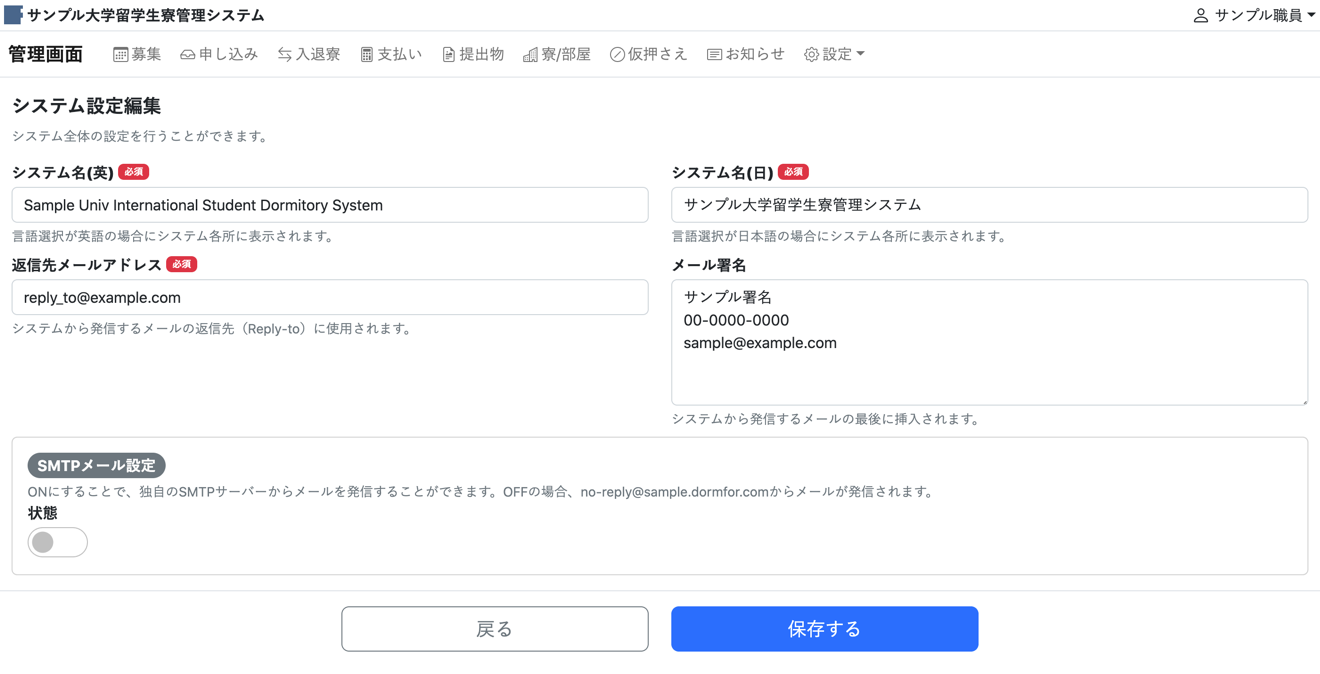 システム全体の設定を行うことができる画面です。システム名称や、メール送信の際の各種設定を行うことができます。