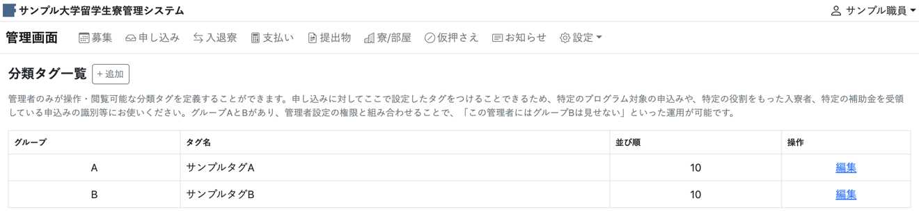 申し込みや入寮者に特定のタグをつけて分類したい場合に利用可能なタグを登録、管理する画面です。グループAとBを使い分けることで、特定の管理者にはグループBは見せたくない、といった運用にも対応可能です。