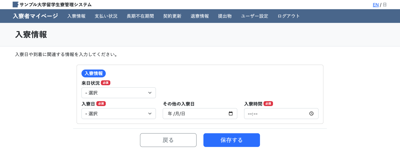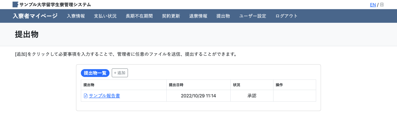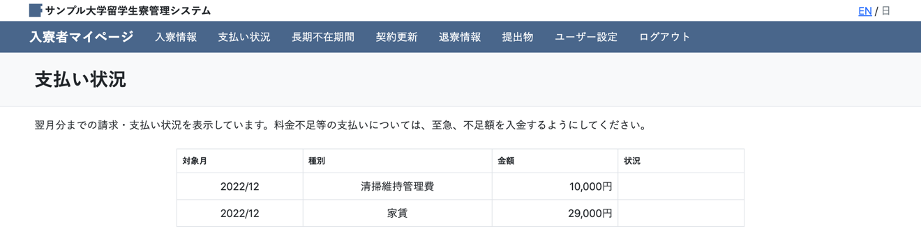どのようなシステムかの参考情報として、入寮が決定した方がログインして利用する入寮者マイページの各画面のスクリーンショットを掲載しています。すべてを掲載すると量が多くなり過ぎるため、細かい動作はお試し期間にご体験ください。