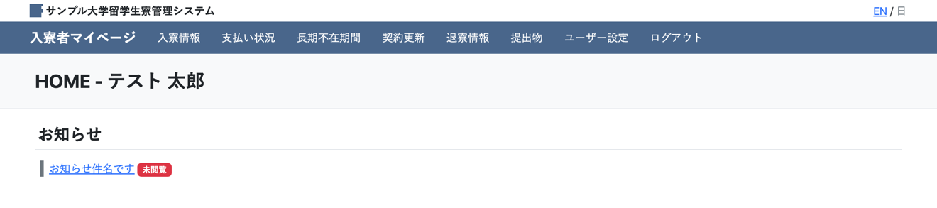 入寮者マイページのHOME画面です。掲示中のお知らせがある場合は表示され、リンクをクリックすることで詳細を表示することができます。未閲覧のものには「未閲覧」というバッジが付記され、閲覧を促します。