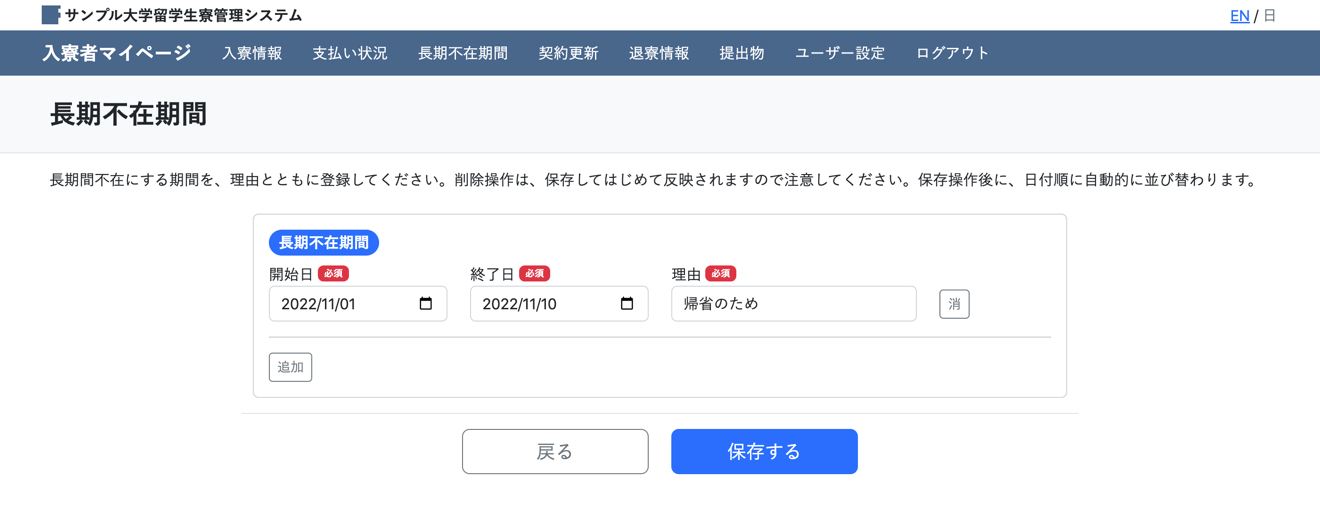 部屋を長期間不在にする期間を登録、管理できる画面です。一時帰国による不在等、寮管理上把握しておく必要がある場合に登録を促してください。