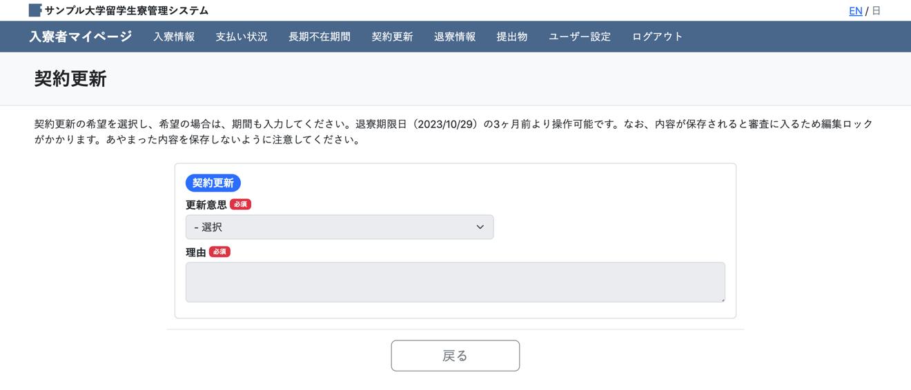 退寮日や、退寮後の連絡先等の情報を登録できる画面です。登録期間外の場合は編集できないようにロックがかかります。