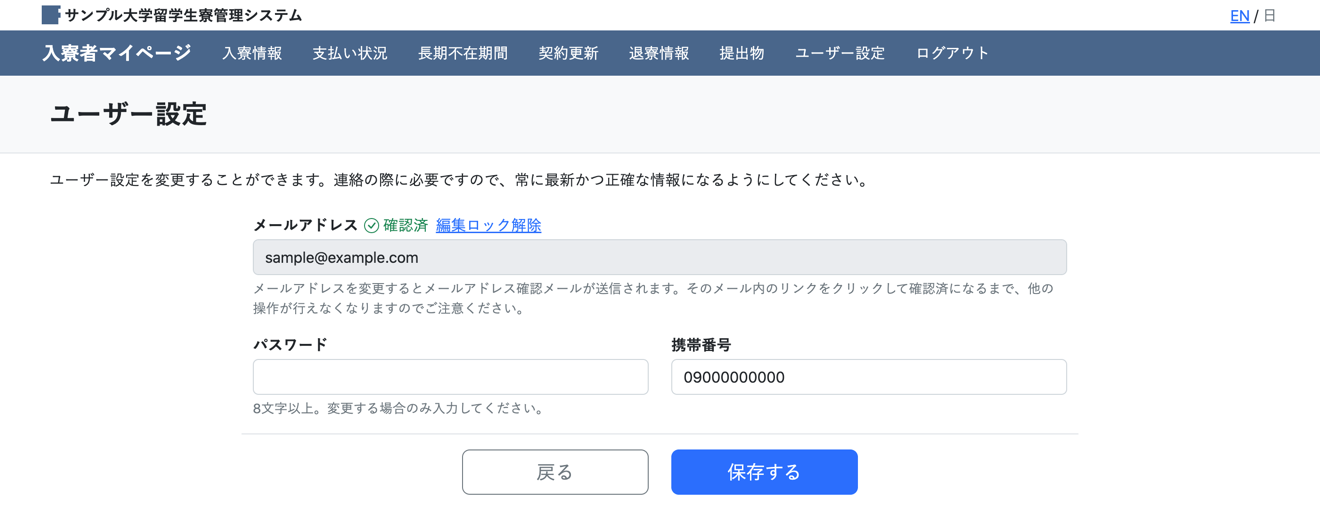 メールアドレスやパスワード等を管理できる画面です。ここの情報を基に入寮者への通知メールが送信されます。